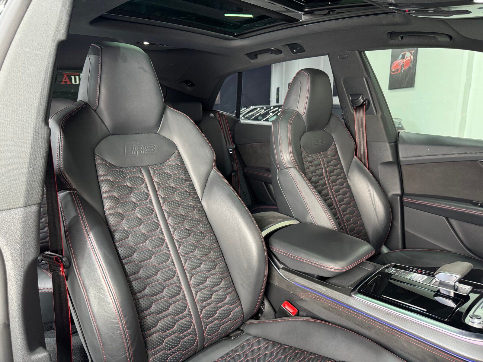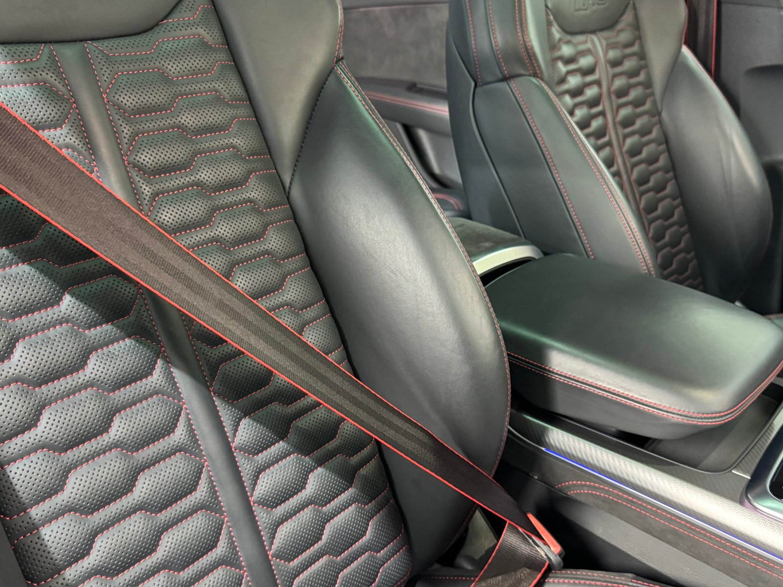 -Asientos con tapicería en cuero negro con diseño panal de abeja e inscripción RS